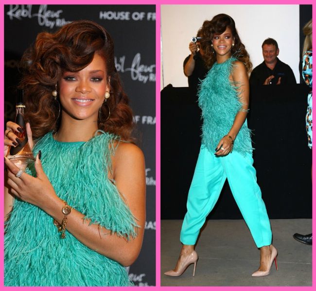 Rihanna are un stil aparte, o combinatie intre sexy si...uneori vulgar. La lansarea parfumului ei din acest an, Rihanna a ales o costumatie cel putin ciudata - un costum turcoaz cu pene in partea de sus. Lungimea pantalonilor nu a avantajat-o deloc pe cantareata, care parea ca are picioarele mult mai scurte.