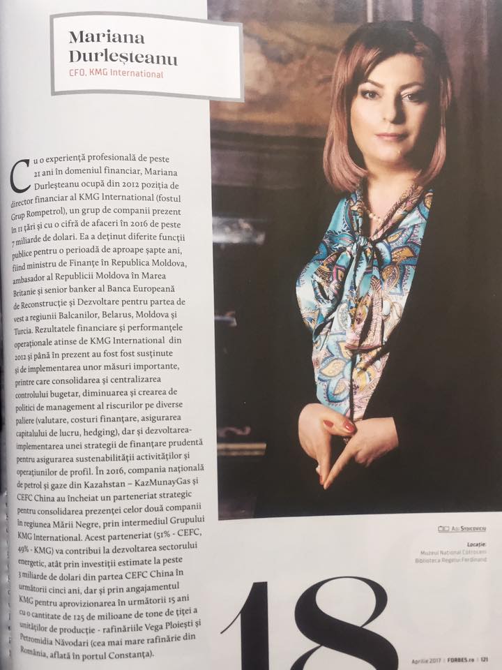 Publicația română, autointitulată și „Inima Business-ului” o prezintă pe Mariana Durleșteanu – Directorul Financiar al companiei române KMG International (fostul grup Rompetrol) încă din 2012. Acest grup de companii este prezent în 11 țări, iar în 2016 înregistra o cifră de afaceri de peste 7 miliarde de dolari.
