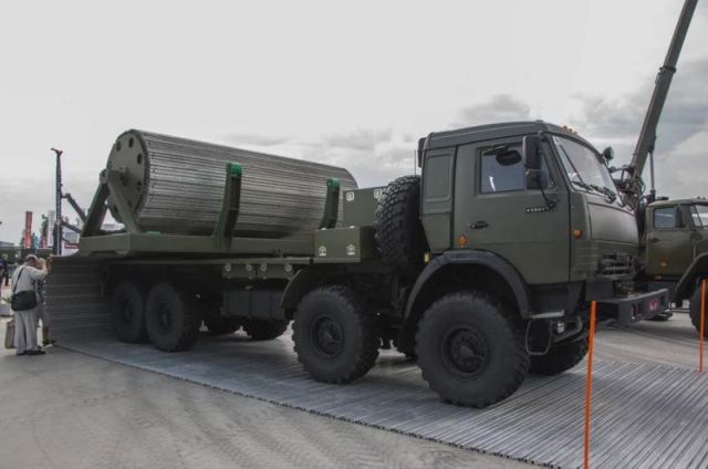 Перед вами уникальный многоцелевой механизированный комплекс оперативного развертывания временных дорог, который позволяет в течение короткого времени обеспечить проезд любой техники на непроходимых и заболоченных участках местности. Комплекс временных дорог построен на базе КамАЗ-63501 и оснащен полотном дороги длиной 100 метров и шириной 4,6 метра.