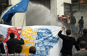 Grupul 2, după ce s-a asigurat de o prezenţă masivă a tinerilor, a purces la treabă — hârtii aruncate, sticle de plastic, forţări ale cordoanelor de poliţişti şi jocurile de-a prinsa prin faţa Parlamentului şi a Preşedinţiei… aici apare şi Grupul 3. Au urmat regretatele devastări …Arborarea drapelelor a fost un pretext pentru a întrerupe relaţiile diplomatice cu «Ţara agresoare».