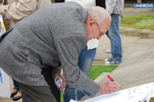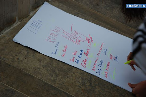 Organizatorii,dar şi câţiva susţinători au semnat pentru modificarea articolului 13din Constituţie. Trecătorii au apreciat pozitiv iniţiativa tinerilor.Unul din trecători, o doamnă în etate, a menţionat că luptă pentru limbaromână din 1966, iar acum a venit rândul tinerilor să facă acest lucru.