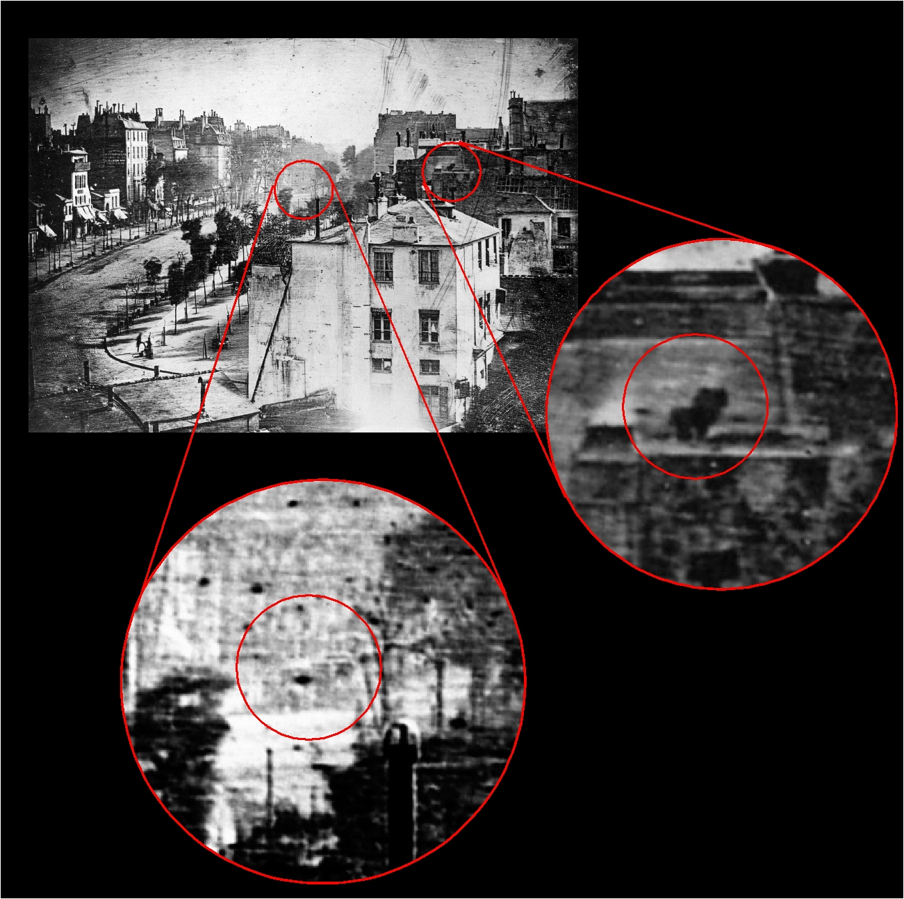 Французский дагерротип в смысле поиска людей гораздо интереснее — ведь любой в меру статичный парижанин или гость города четырёх революций, попавший на снимок, становится первой персоной, увековеченной с помощью фотографирования!