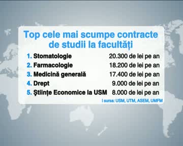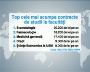 Cele mai mari taxe de studii sunt percepute la cele mai solicitate facultăţi. Între 5.000 şi 20.000 de lei variază taxele anuale de şcolarizare în Moldova.Anul acesta, lider în topul celor mai scumpe contracte de studii este facultatea de stomatologie. Taxa anuală de şcolarizare este de 20.300 de lei. Pe locul doi şi trei se află facultăţile "Farmacologie" cu 18.200 de lei şi "Medicina Generală" cu 17.400 de lei. Pe locul patru se situează facultatea de Drept a Universităşii de Stat cu o taxă de 9.000 de lei, urmată de facultatea de Relaţii Economice Internaţionale, unde contractul de studii este de 8.000 de lei.