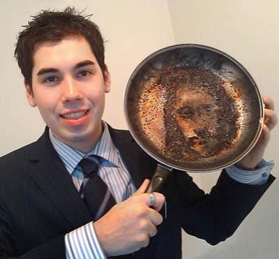Тоби Эллс демонстрирует сковороду с образом Иисуса Христа. По его словам, образ появился на сковороде после того, как он прилег отдохнуть и забыл, что поставил сковороду с беконом на плиту.