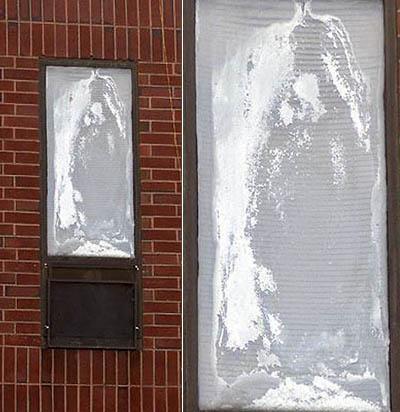 Толпы любопытных приходили к медицинскому центру Милтона в Бостоне, чтобы посмотреть на образ Девы Марии, созданный водой между стеклами в июне 2003 года.