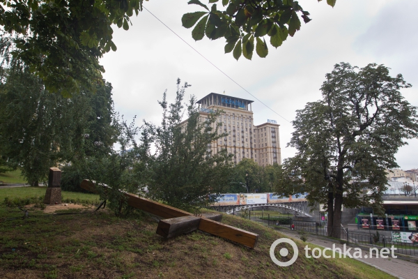 В знак поддержки арестованным Pussy Riot девушки из Femen спили бензопилой деревянный крест над Майданом Независимости, который стоят возле бывшего Октябрьского дворца.