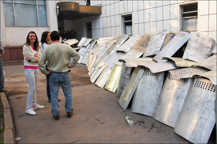 Толпа с этой стороны здания настроена неагрессивно, что-то в воздухе поменялось.