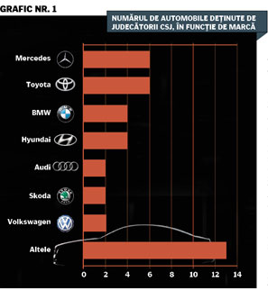 La CSJ activează 33 de judecători. În declaraţiile cu privire la venituri şi proprietăţi pe anul 2012, patru magistraţi susţin că nu deţin automobile, iar ceilalţi 29 de judecători deţin, în total, 39 de automobile. Cele mai populare automobile pe care le folosesc judecătorii de la CSJ sunt de model Mercedes şi Toyota — 12 automobile, BMW şi Hyundai — 8 automobile, Audi A6 — 2, celelalte fiind de diferite modele (Grafic nr. 1).