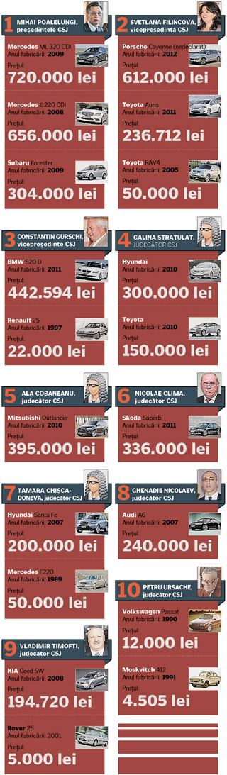 Primul loc în topul cu cele mai multe şi mai luxoase automobile de la CSJ îl deţine Mihai Poalelungi, preşedintele CSJ, care declară că este proprietarul a două Mercedes-uri în valoare de peste 1,3 milioane de lei şi a unui Subaru Forester, estimat la 304 mii de lei. Pe locul doi se află Svetlana Filincova, vicepreşedinta CSJ, care deţine şi funcţia de preşedintă a Colegiului civil, comercial şi de contencios administrativ din cadrul aceleiaşi instituţii. Ea a declarat că deţine două automobile de model Toyota în valoare de aproximativ 300 mii de lei.
