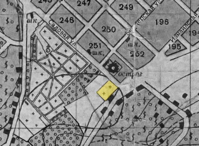"Речь идет о самом начале 50-х годов. Место, называемое нами сквером, ограничивалось с одной стороны небольшой группой жилых домиков с участками, с другой остатками полуразрушенной кладбищенской ограды из разномастного бутового камня. Все это игрище было покрыто бурьяном, основательно вытоптанным нашими ногами в радиусе метров 70-80 от улицы Садовой. А далее, вглубь от улицы, шли поросшие высоким бурьяном "пустоши" или не угодья, как бы покрытые относительно мелкими шрамами впадин и хребтов. Они уходили к югу, постепенно опускаясь к долине у Синей горки. Еще один, не знакомый для современников 2000-х, топоним.